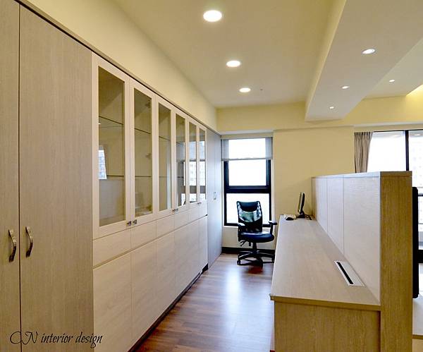 屋主有收藏大量的書籍、以及不少骨董展示品,因此在書房規劃了一整排的收納展示櫃。