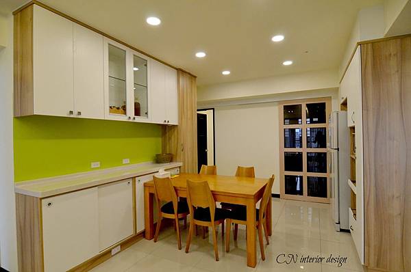 規畫了餐具高低收納櫃,餐櫃檯面選擇米黃色人造石增添質感,壁面彩牆使用的是亮綠色點綴,整體看來蓬勃有朝氣。