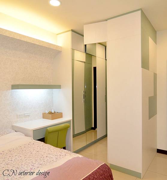 搭配法拉利拉門衣櫃,形成一體,衣櫃側面是收納型書櫃,小空間也能做出不同機能型的收納方式。