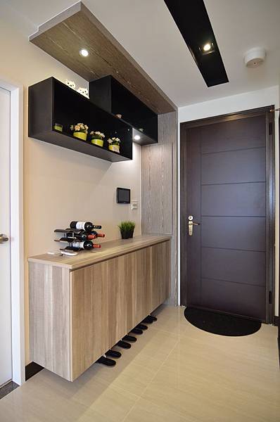 於是從玄關鞋櫃旁到電視牆規劃了一整排系統門片造型修飾,