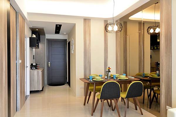 局部加入系統板材搭配彩牆跳色,形成了一個舒適的用餐空間。