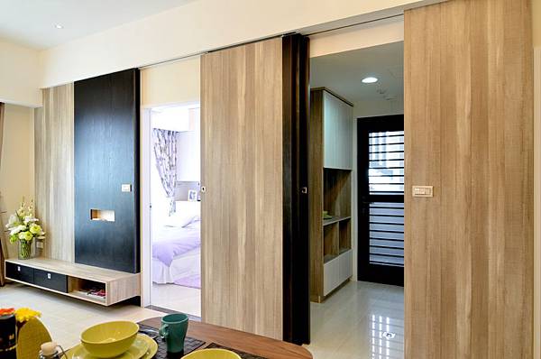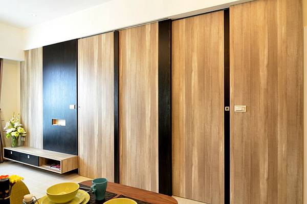 讓電視牆視覺延伸且完全修飾主臥門及廚房區域,各自形成獨立的空間。