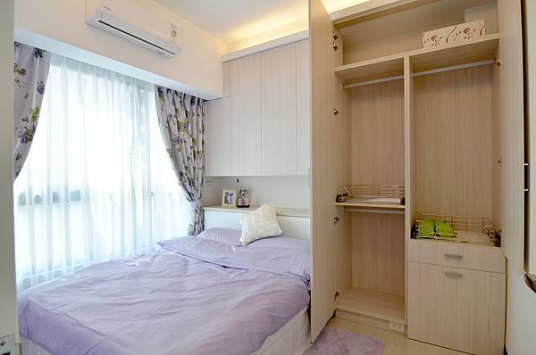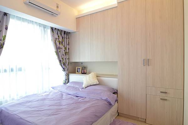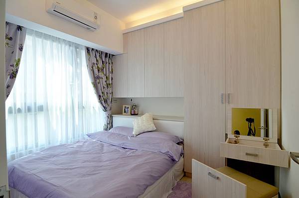 因空間上的限制,所以在床頭保留了一整排收納,衣櫃兼化妝台,