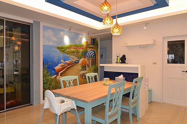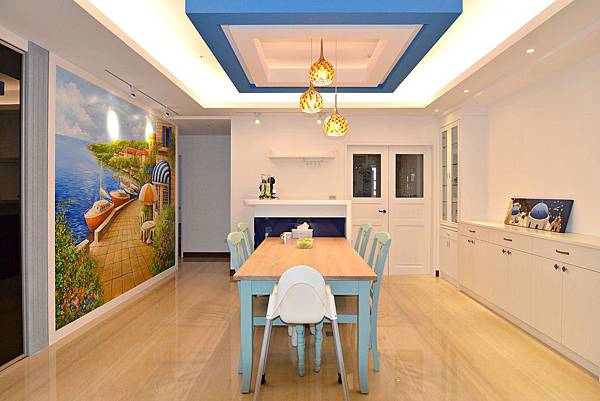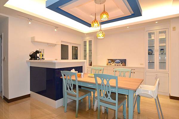用餐區整體空間以藍色與白色相互搭配,呈現純樸自然的空間