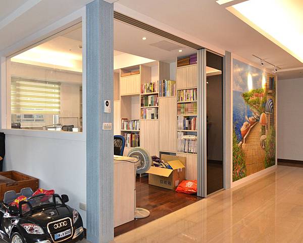 刻意將原有磚牆隔間打除一半,改以穿透玻璃材質作為書房兩面的隔間,除了擴大公共空間之外,也融合了些許現代元素