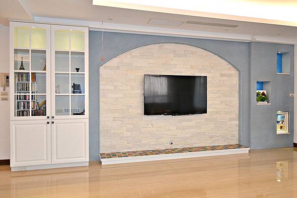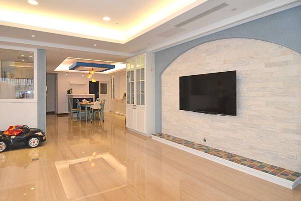 (上)(下)原有電視牆造型拆除,貼上石材,再以彩磚與大理石漆裝飾,簡單的造型效果卻非常突出,也同時將電視牆延伸,使公共空間整體更加寬闊