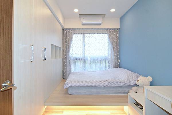 女兒房利用門後空間施作整排高櫃(包含書櫃及衣櫃功能),並利用地板櫃增加收納空間,以白色為基調,搭配天藍色彩牆,呈現清爽如藍天白雲般的空間感。