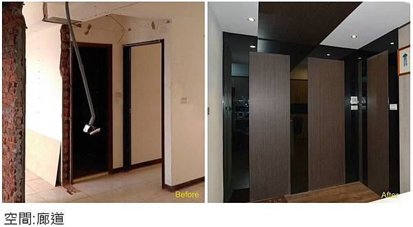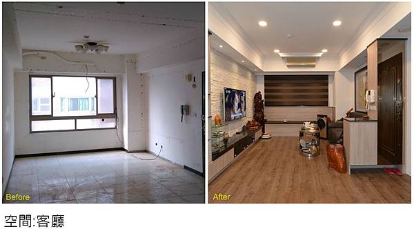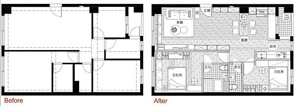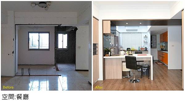 將屋內舊有裝潢拆除(天花板、木作、廚具…等),連同原有儲藏室隔間牆也拆除,盡可能減去阻隔視線的任何裝潢,使公領域空間整體串聯形成開放式空間,小空間瞬間放大,製造出舒適寬敞的環境,同時引入光線至客廳、餐廳,進而延伸至廚房及空間各處,利用自然光源提升整體亮度,並以低甲醛的系統櫃補足收納空間,打造環保健康的環境,使生活機能性更加完善。