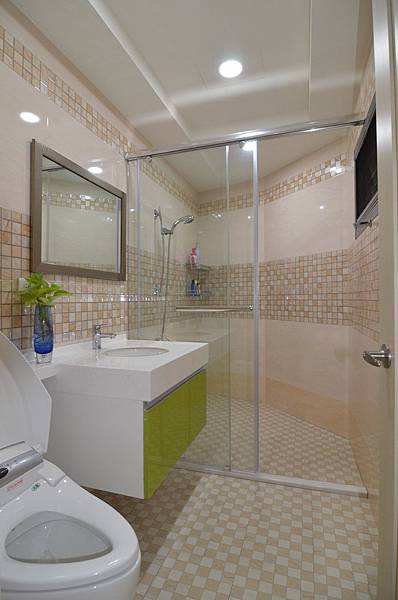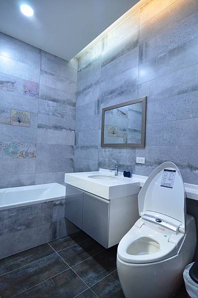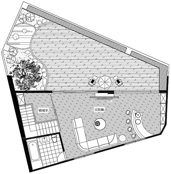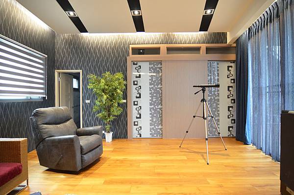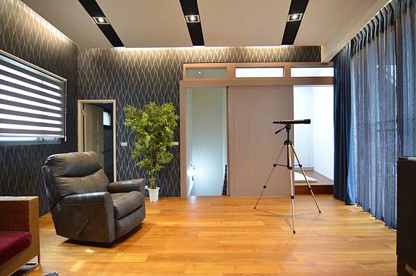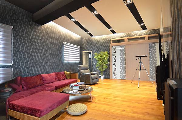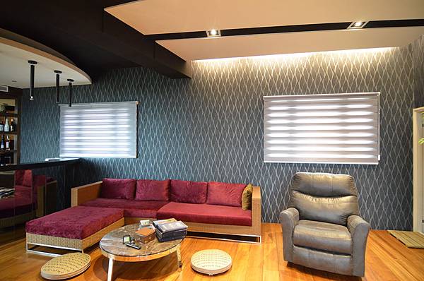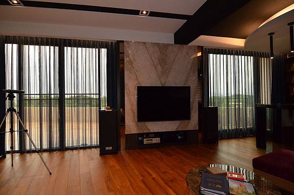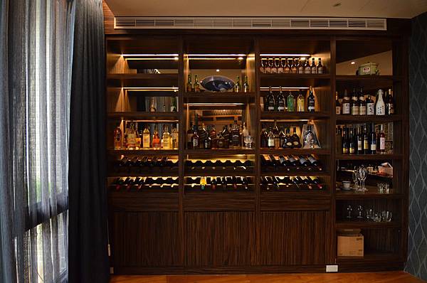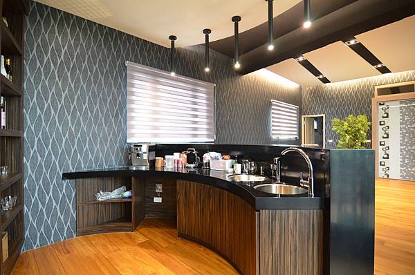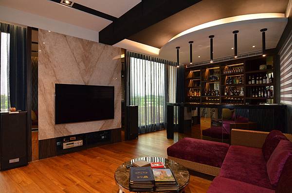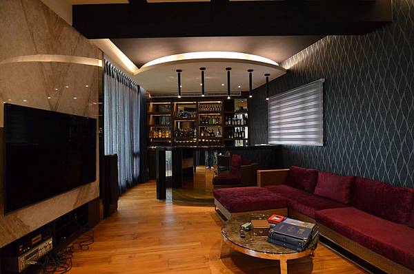 業主長年在國外經商的關係,希望能有迎接外國貴賓的地方, 並保留一間房間讓客人留宿,因此設定3F為交誼廳。為了虛化空間上不方正的感覺,大理石電視牆設定在兩大片落地窗中間,採光良好,並同時欣賞陽台美景,吧台及天花板也以圓弧造型修飾空間上的銳角,由於業主有品嘗美酒的習慣,需要大量收納及展示美酒的空間,於是運用深色木皮、鏡面及燈光效果的木作櫃體來充分凸顯出美酒的高貴質感,成為家人舒適、放鬆的空間。