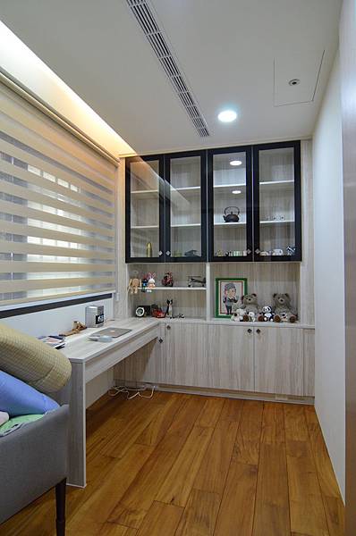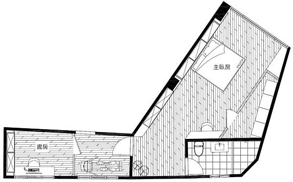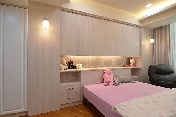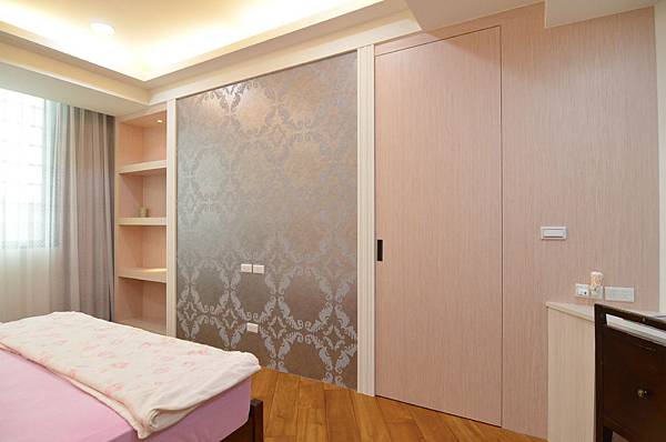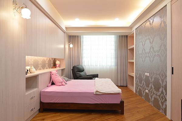本案格局歪斜及銳角太多,為破解空間不方正及避免樑壓床頭,2F主臥房利用櫃體修飾床頭的樑與柱子並拉平,及木作隔間隔出一間更衣室,同時將空間調整為方正,不僅增加收納功能,也滿足業主擁有更衣室的需求。全室地坪以海島型實木地板,手推油的自然溫潤更顯空間質感。