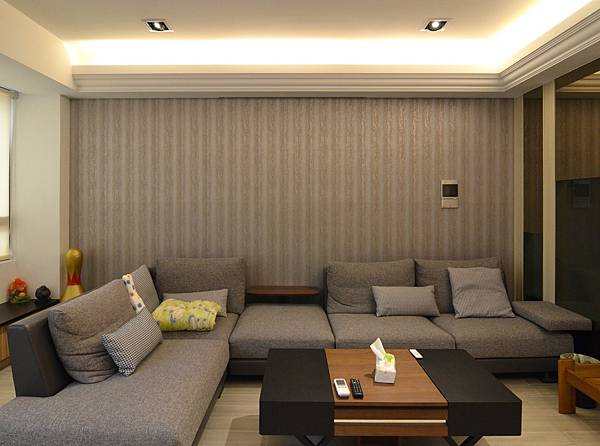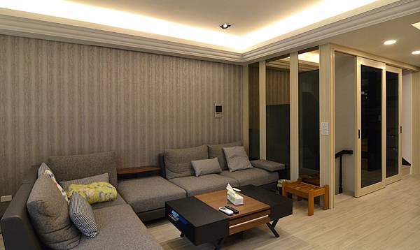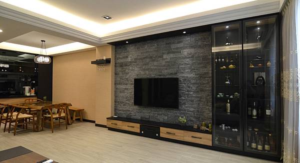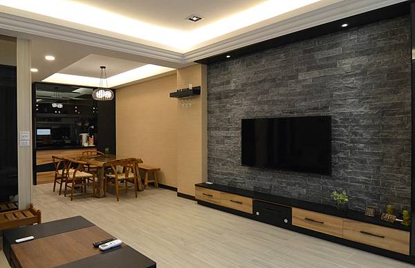 運用灰色調麗晶石及木質感塑合板互相搭配營造現代休閒溫暖的氛圍