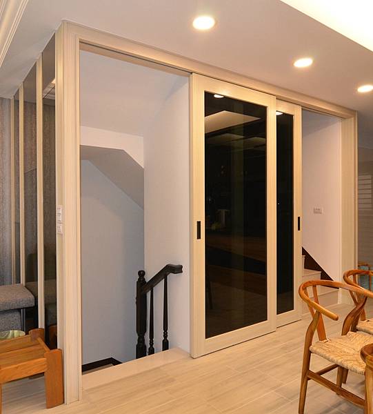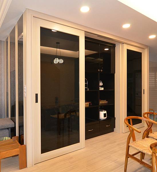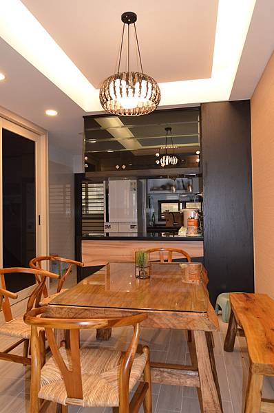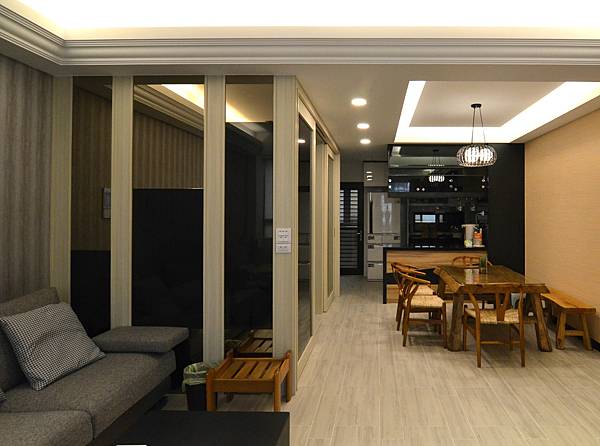 木作隔間搭配鏡面產生放大效果並兼具屏風功能