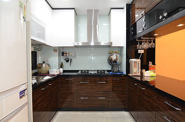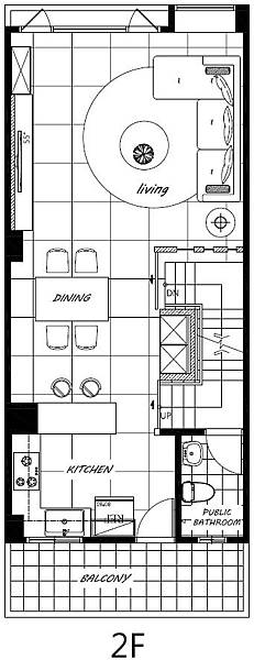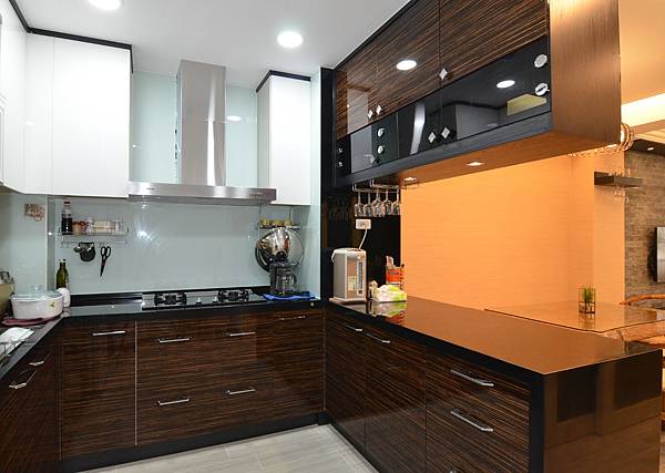 塑合板修飾柱子延伸中島造型並擋住爐台兼劃分出餐廳與廚房的開放式空間