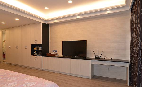 主臥電視櫃兼具書桌功能,連接衣櫃一體成型,讓空間看起來方正、完整,有放大效果