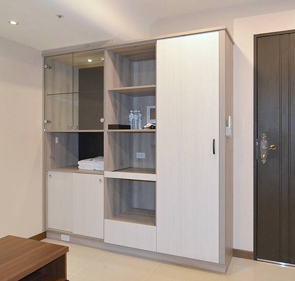 所以在此處設計高櫃遮蔽電箱、連接電器櫃及展示多功能櫃收納。