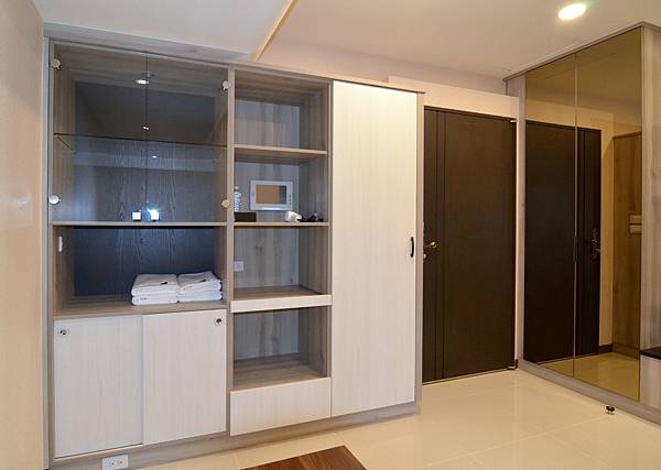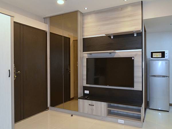 風格為現代黑白,鞋櫃門片鏡面有放大空間效果兼當穿衣鏡。