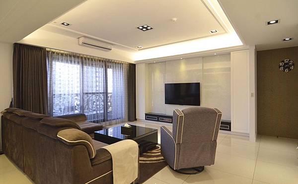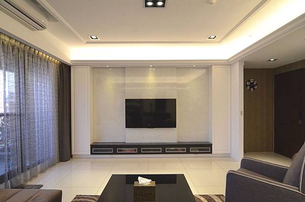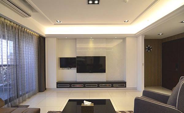 結合業主親子活動需求,客廳空間共規劃兩組視聽設備,將一組設備隱藏於主電視牆後方。