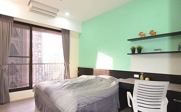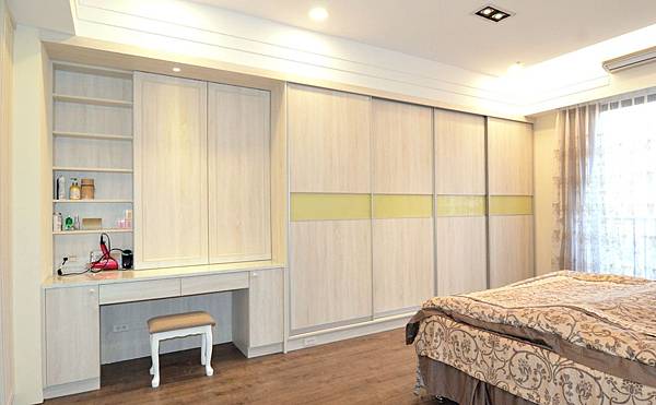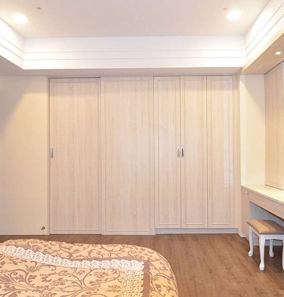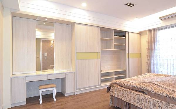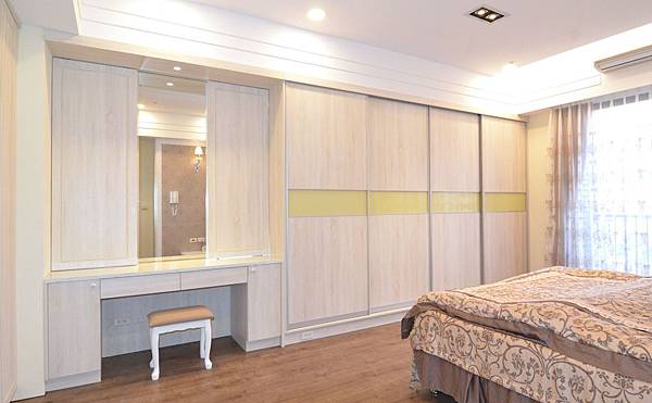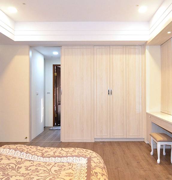 主臥室大量使用系統櫃,衣櫃、收納櫃之外,連同梳妝台隱藏門、收納櫃兼隔間櫃以及更衣室橫拉門,皆可使用系統板材施作!