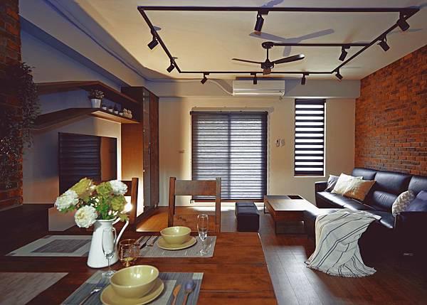-異材質MIX- 以軌道燈及黑吊扇黑玻等鐵件軟裝 渲染出流行元素在其中。